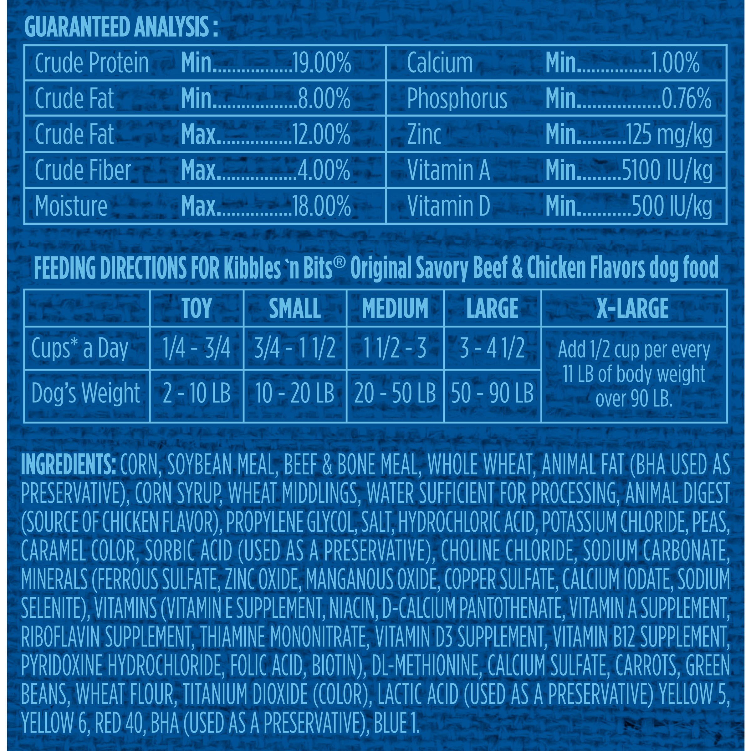 Kibblesn bits chefs choice bistro oven roasted beef flavor dog food is formulated to meet the nutritional levels established by the aafco dog food nutrient profiles for maintenance. Feeding feed an adult dog the recommended amount once a day. The protein in kibbles n bits savory beef chicken flavor dog food for dogs of all sizes is within the percentage level provided by the government with 19 percent minimum crude protein 18 percent is the recommended minimum for adult dogs.
