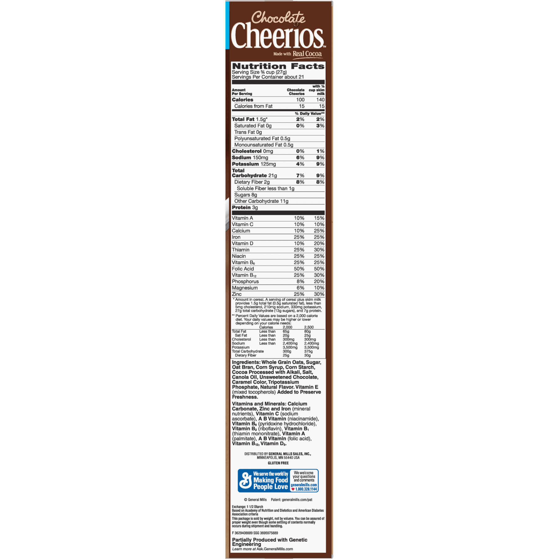Place cereal in medium mixing bowl. Stir together with rubber spatula until thoroughly coated. Chocolate cheerios general mills 34 cup 1000 calories 220 grams carbs 15 grams fat 10 grams protein 20 grams fiber 0 mg cholesterol 0 grams saturated fat 1700 mg sodium 0 grams sugar 0 grams trans fat.