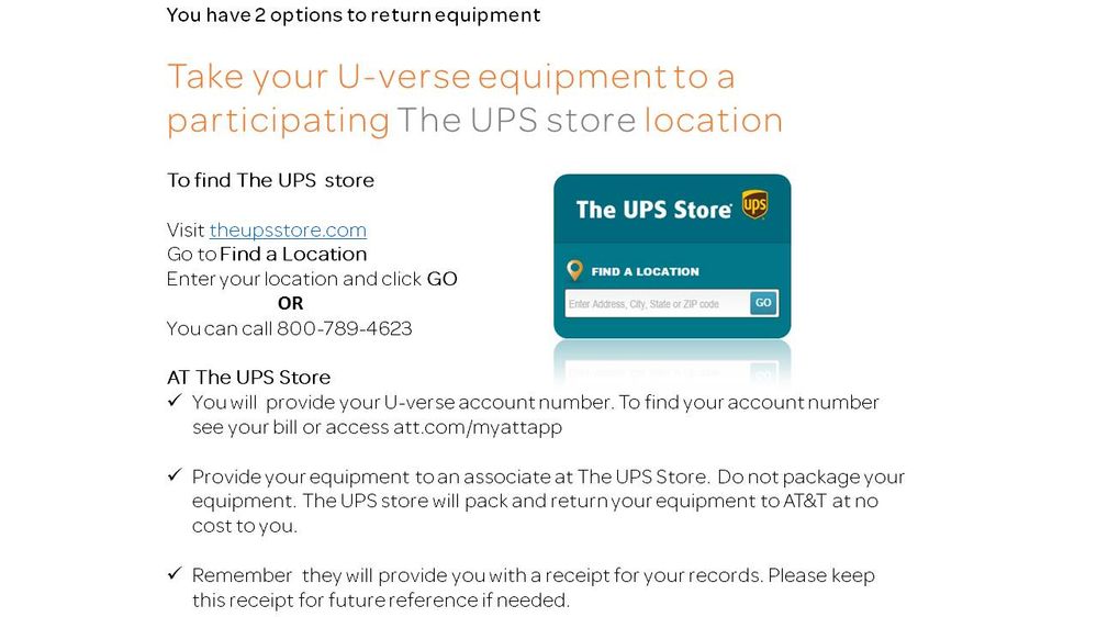 Mail via the us. If you gave it to ups and it was actually a usps return it will eventually get to the right place but its going to delay things quite a bit. After you return your equipment to att allow a few days for a credit to post to your account and for your equipment discount to be restored.