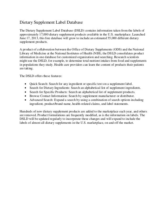 Launched in june 2013 this free resource will grow to include most of the different dietary supplement products sold. The dietary supplement label database dsld from the national institutes of health nih contains information taken from the labels of approximately 76000 dietary supplement products available in the us. Dietary supplement label database breastfeeding childhood health and wellness pregnancy provides label information from dietary supplement products marketed in the us.