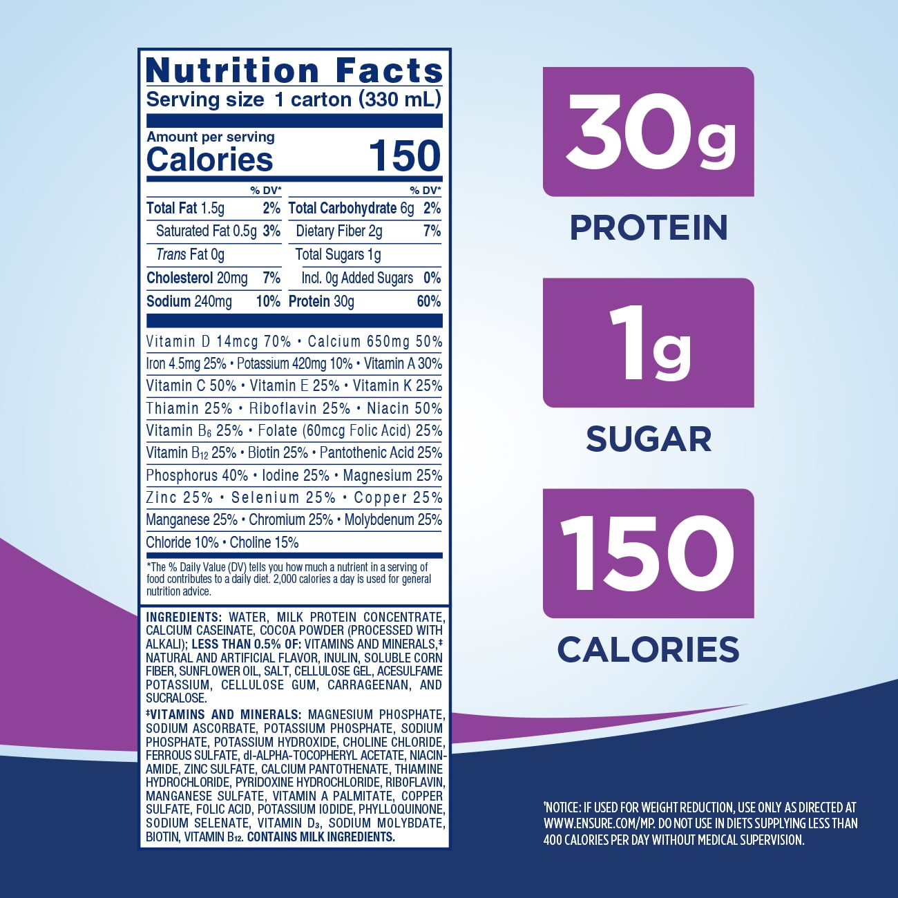 13 grams of high quality protein. Ensure light has 70 80 calories per 8 fl oz compared to ensure original 220 calories per 8 fl oz which is 60 less calories. Ingredients list as per commodity c2085 02.