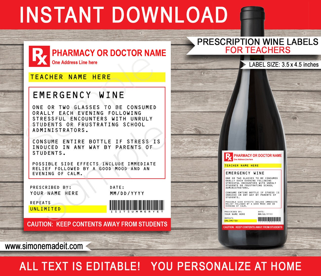 Teacher Wine Bottle Labels Printable Rx Prescription Template For School Teacher Principal End Of Year Gift Editable Text Download