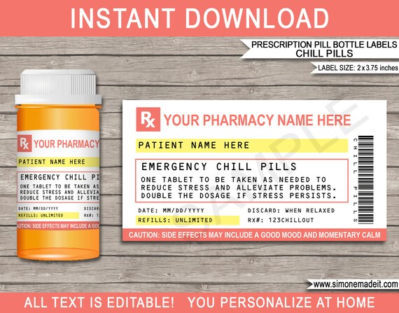 Printable Chill Pill Rx Prescription Labels Template Coral 13 Dram Pharmacy Vials Funny Prank Gag Gift Instant Download Editable