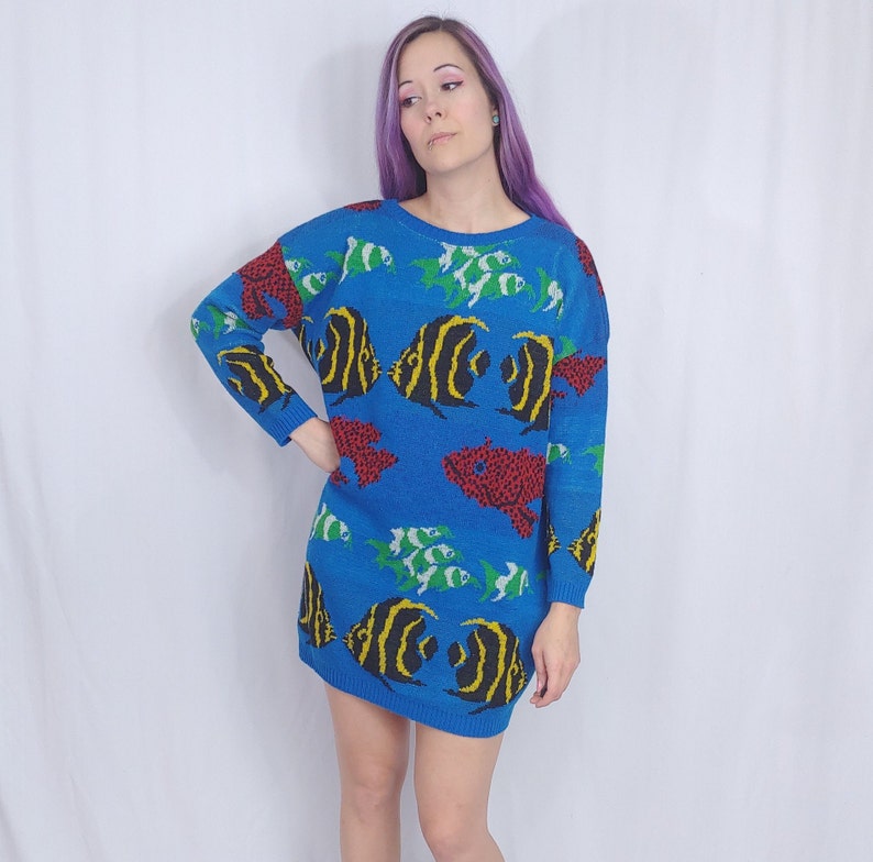 Vtg 80s Betsey Johnson Punk Label Fish Print Over Sized Tunic Mini Sweater Dress Os